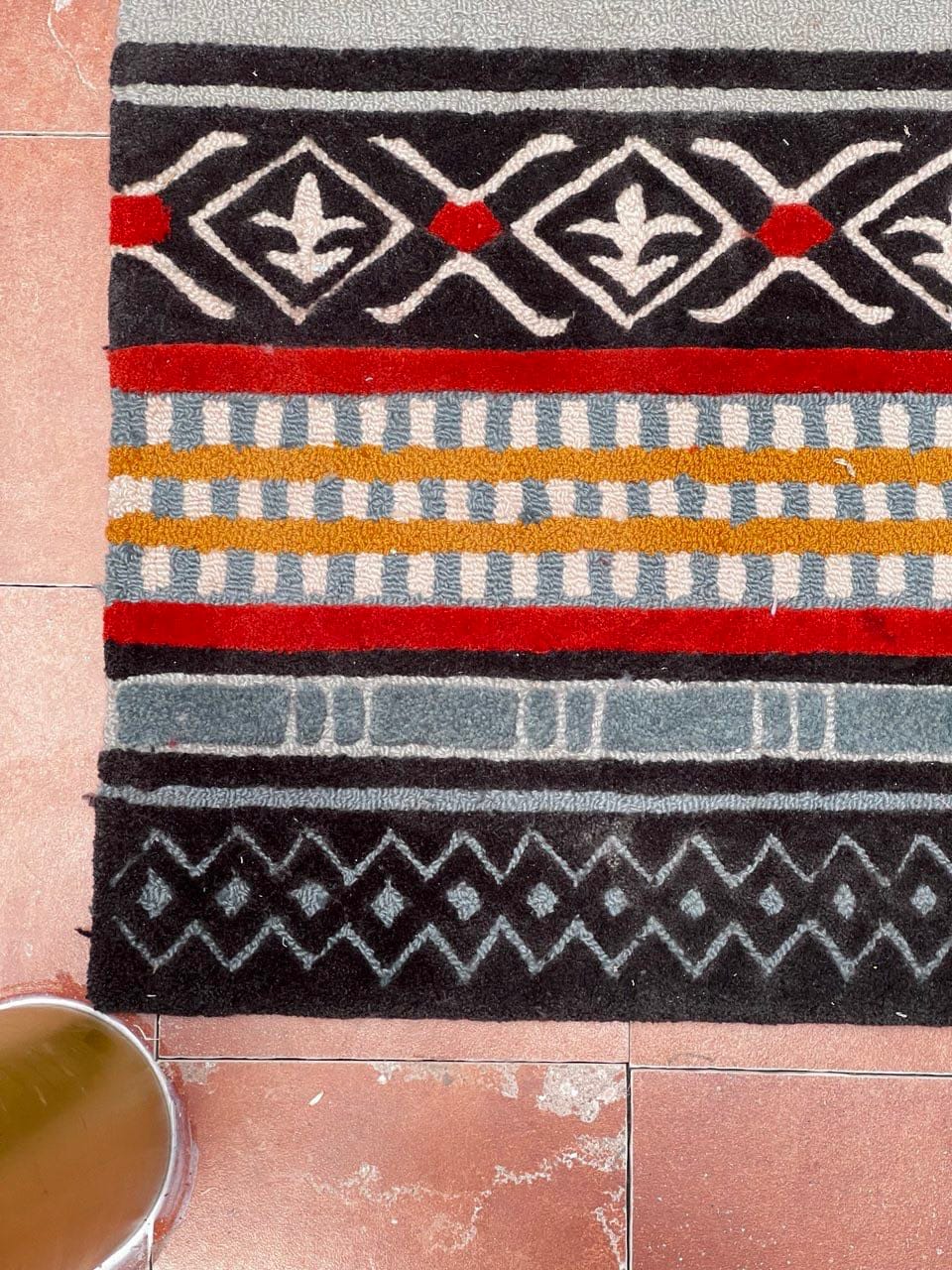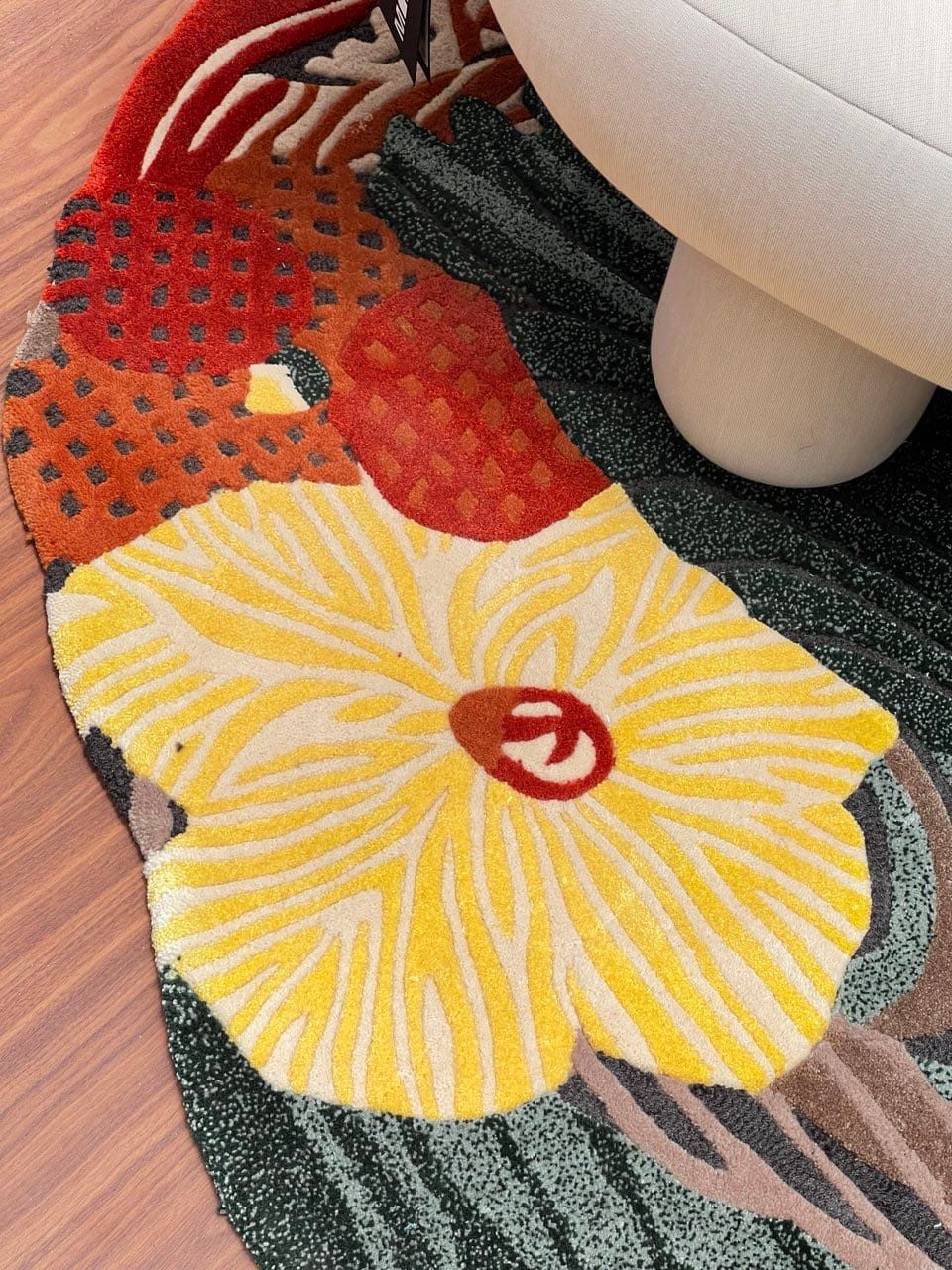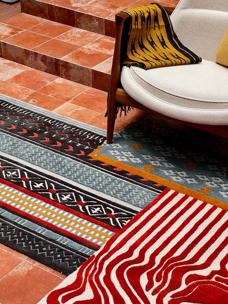 To bring this vision to life, Tara collaborated with FLOORSTUDIO, who crafted a custom hand-tufted rug designed to echo the fluidity of her concept. The rug featured colorful striped effects, carefully blended to complement the space, adding warmth, depth, and tactile richness.