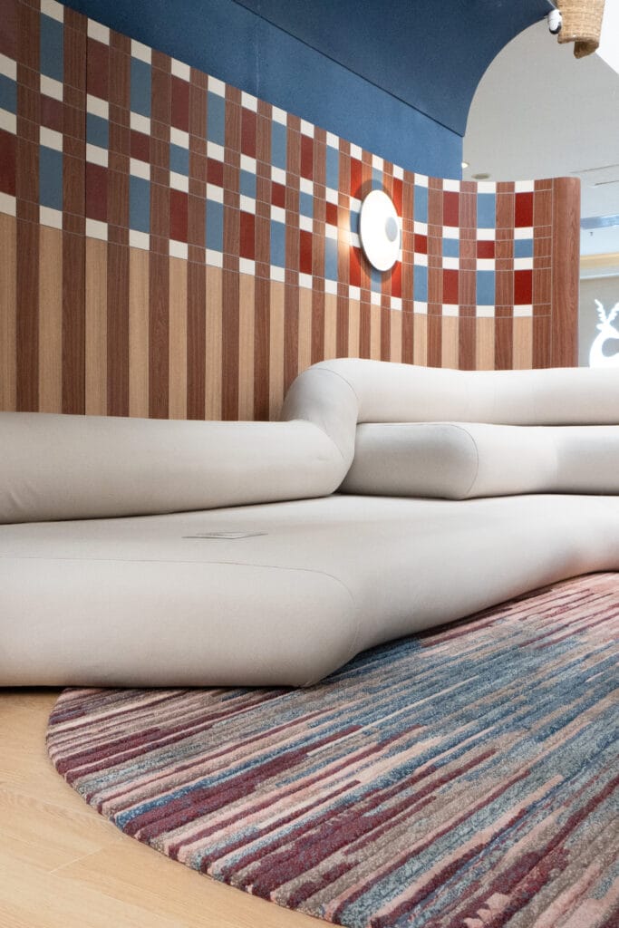 To bring this vision to life, Tara collaborated with FLOORSTUDIO, who crafted a custom hand-tufted rug designed to echo the fluidity of her concept. The rug featured colorful striped effects, carefully blended to complement the space, adding warmth, depth, and tactile richness.